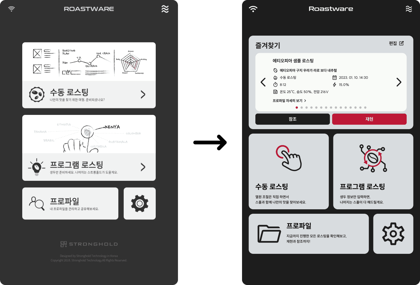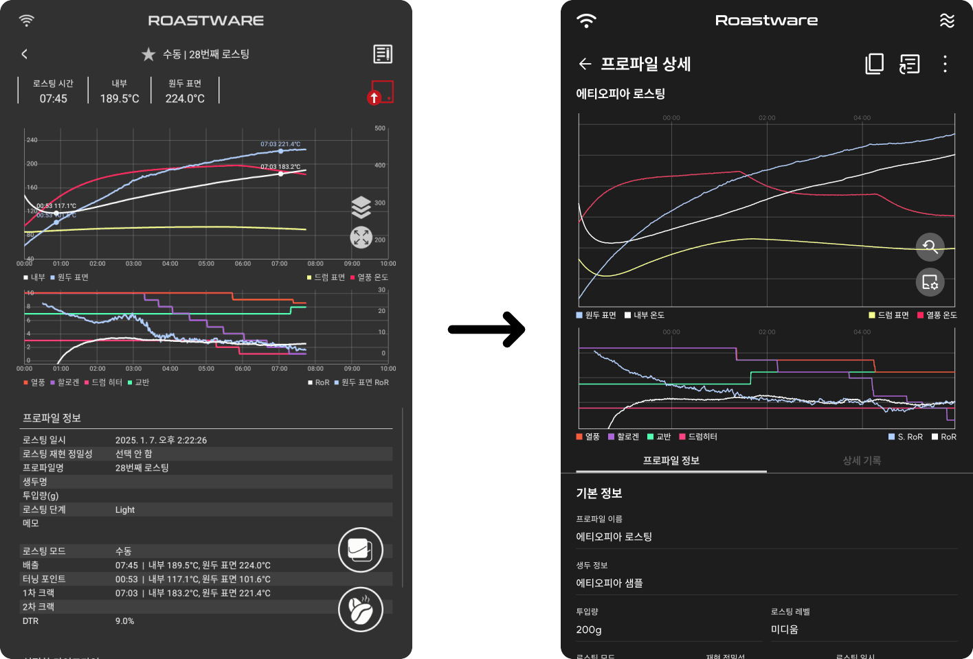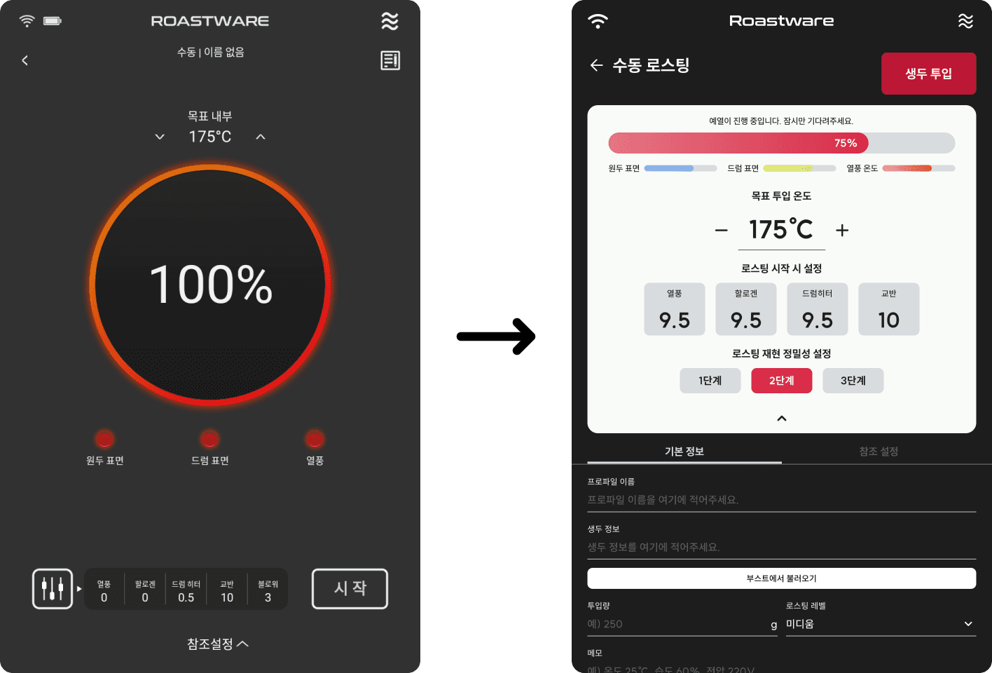 예열화면에서 현재 예열 상태를 보다 명확하게 볼 수 있도록 게이지의 형태가 변경되었습니다. 로스팅 시작 시의 열원 설정과 목표 투입 온도도 변경하기 쉽도록 직관적으로 UI가 수정되었습니다. 프로파일 정보 수정, 참조 프로파일 설정도 더 쉽게 접근할 수 있게 되었습니다.