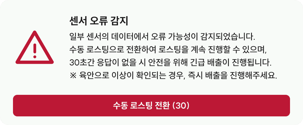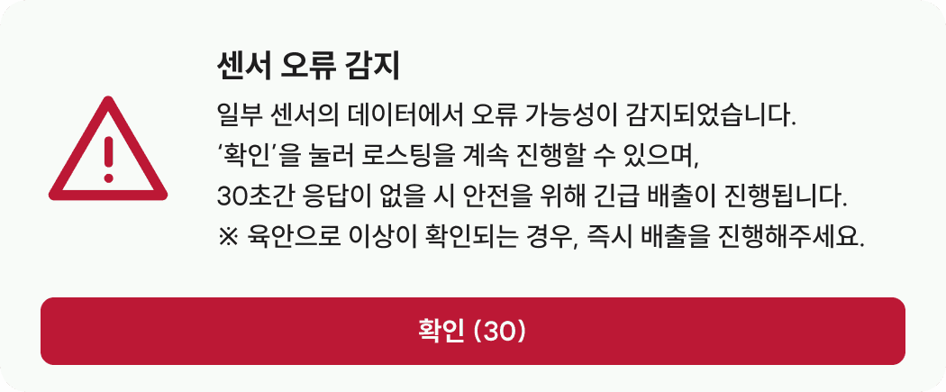 - 센서 오류가 감지된 상태에서 로스팅을 계속 진행할 경우 실제 안정성을 보장하지 않습니다. 육안으로 이상이 확인되면 확인을 누르신 후, 즉시 배출을 진행해 주세요.