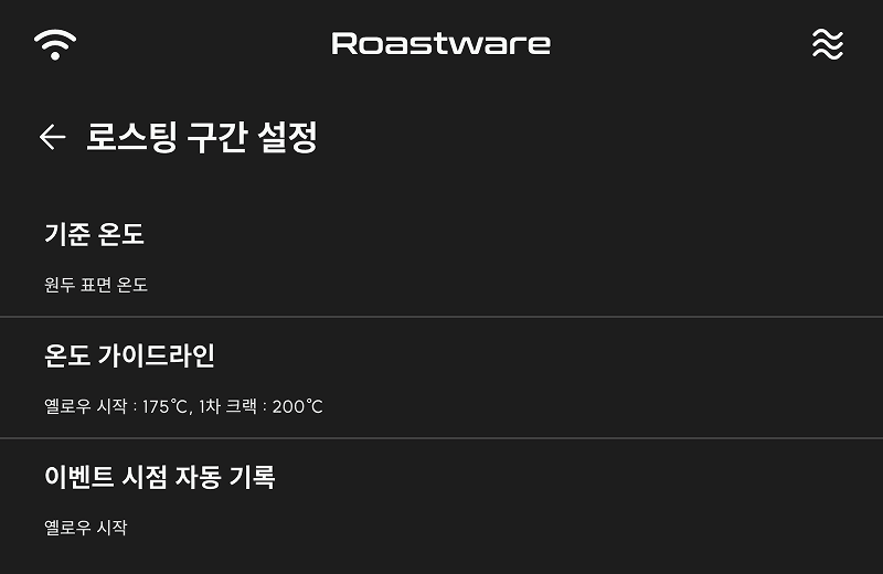설정 내 '로스팅 구간 설정'에서 사용자의 로스팅 환경에 맞춘 세밀한 설정이 가능합니다.