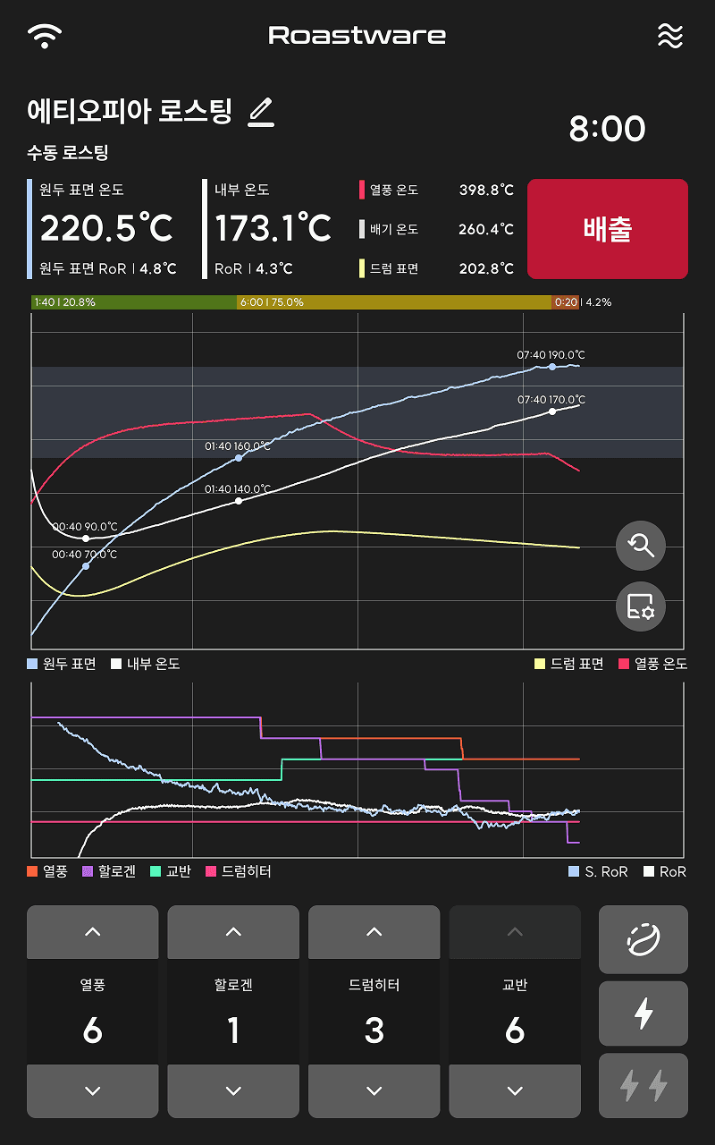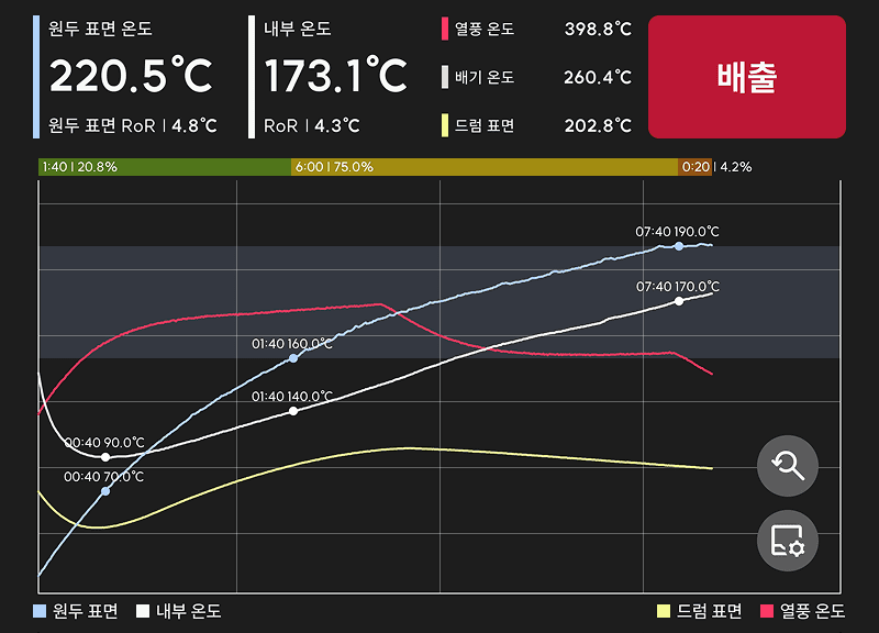 로스팅이 진행됨에 따라 각 구간의 길이와 비중이 바 안에 실시간으로 표시됩니다.