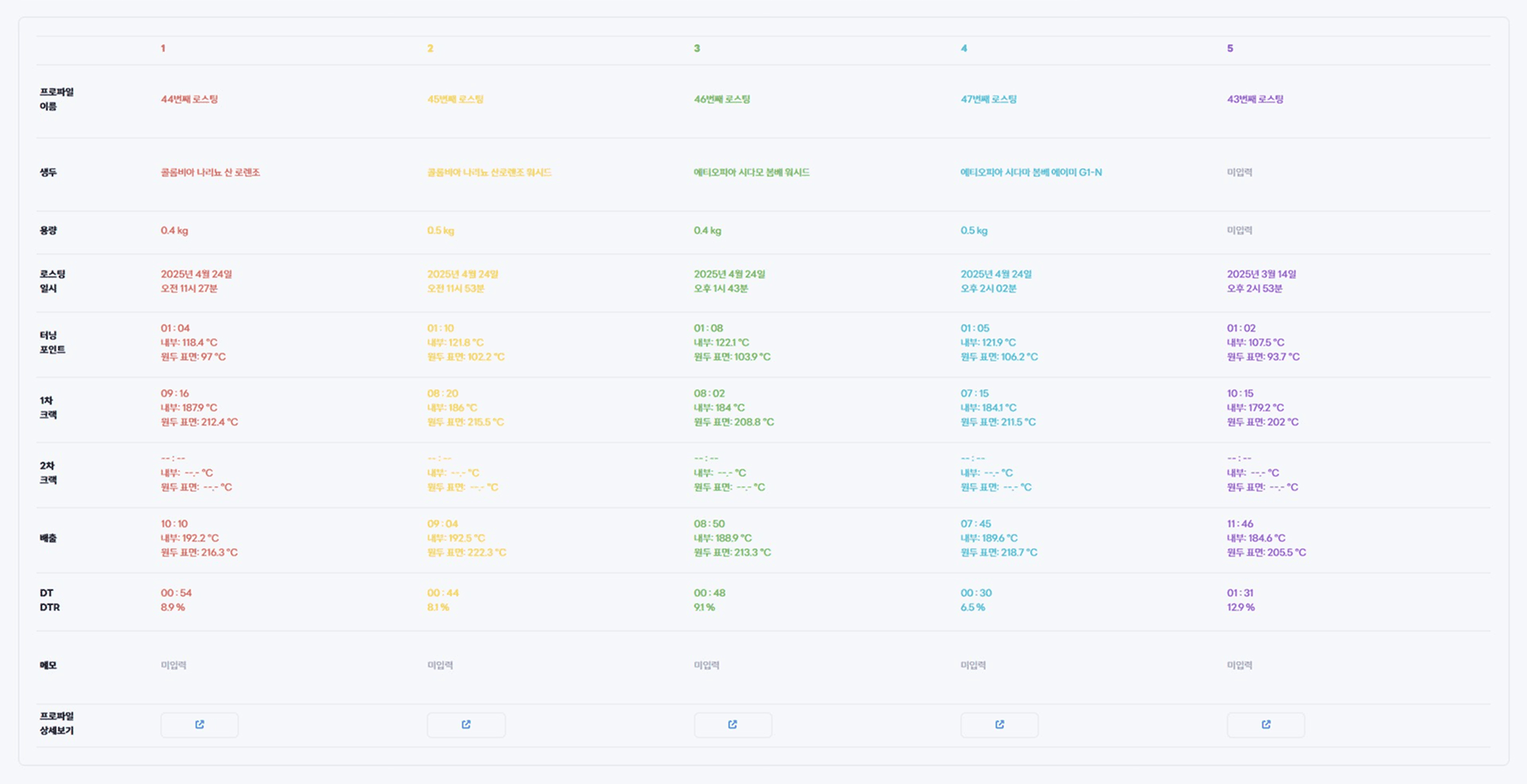 생두 기록과 관련된 자세한 내용은 생두 및 블렌드 기록 확인 부분에서 확인하실 수 있습니다.