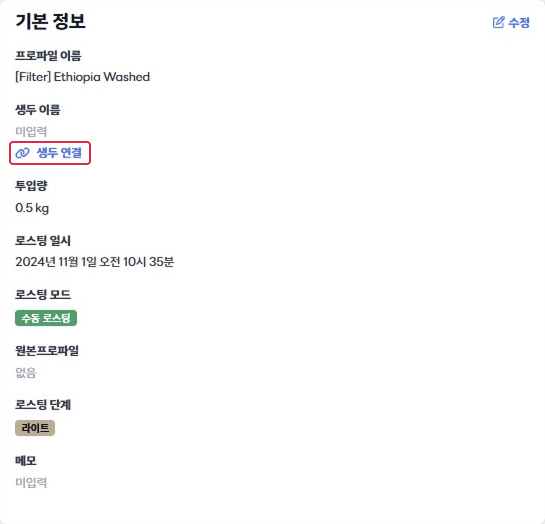 로스트웨어에서 로스터리에 등록된 생두를 선택하지 않고 로스팅을 진행한 경우, 최초 1회에 한해 프로파일에 생두 정보를 연결할 수 있습니다.