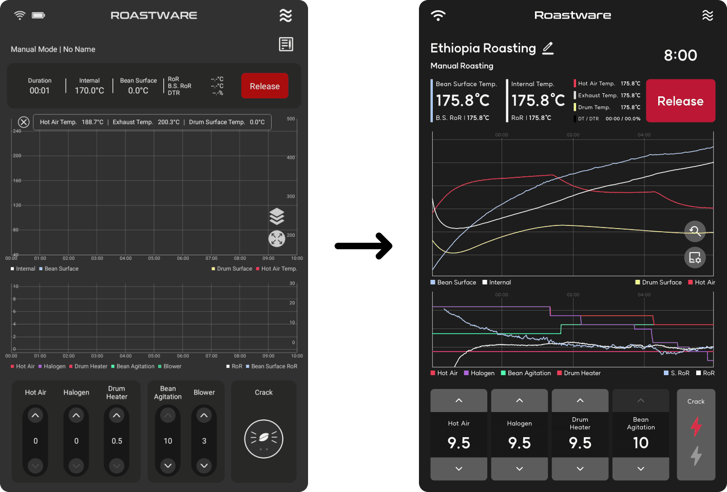 The font size has been adjusted on the roasting screen to make all temperatures easier to read. The size of heat source adjustment buttons and crack buttons has also been changed for more convenient operation.