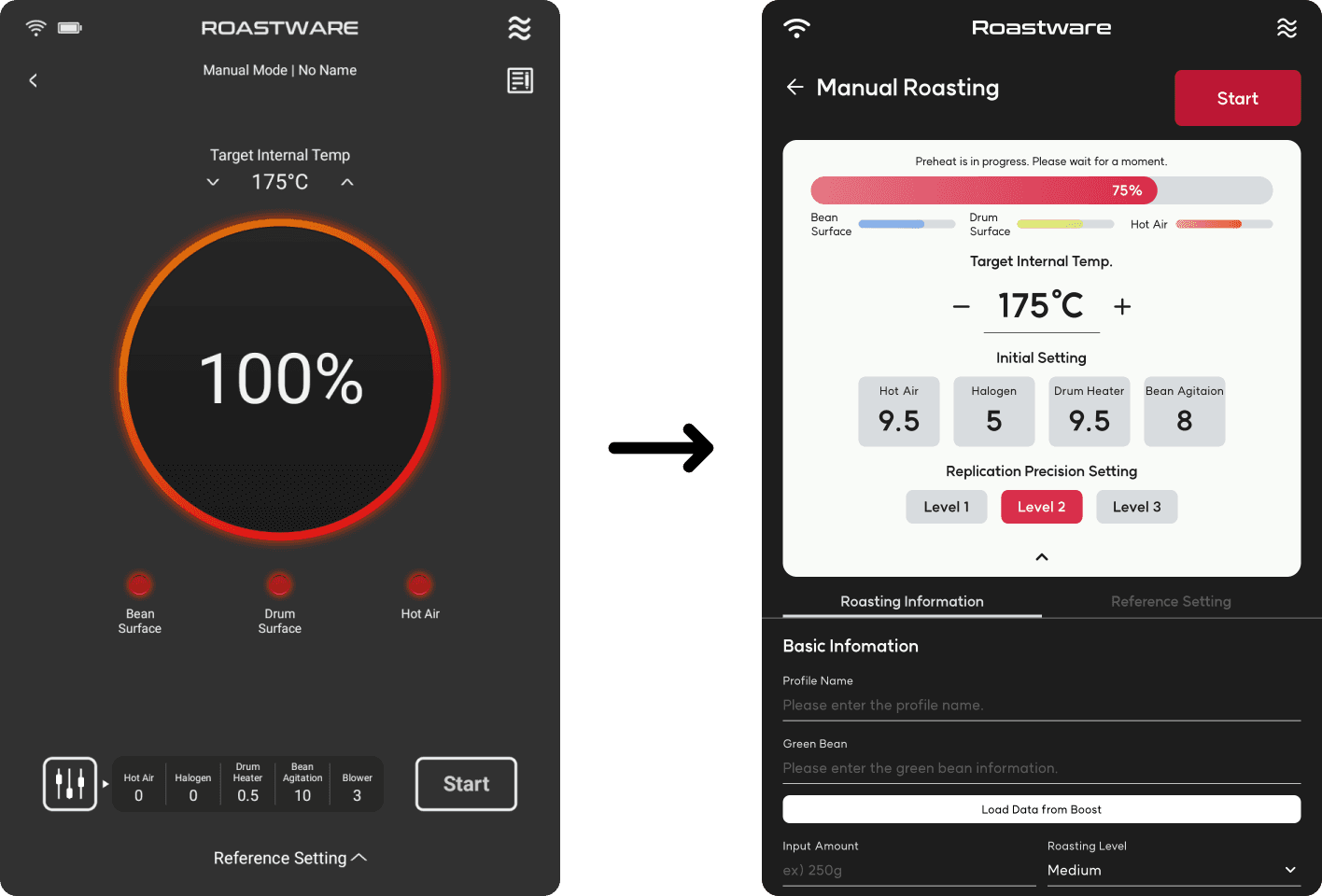 The gauge format has been changed to make the current preheat status more clearly visible on the preheat screen. Adjustments to the heat source settings and target input temperature at the start of roasting have been made more intuitively accessible. Profile information modification and setting reference profiles have also become easier to access.
